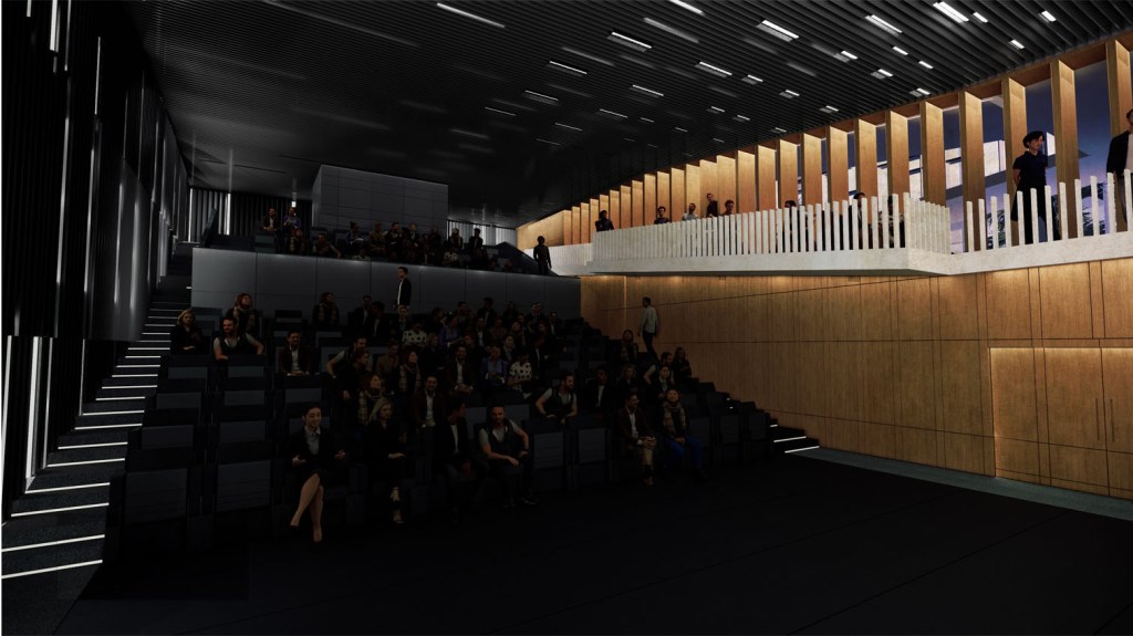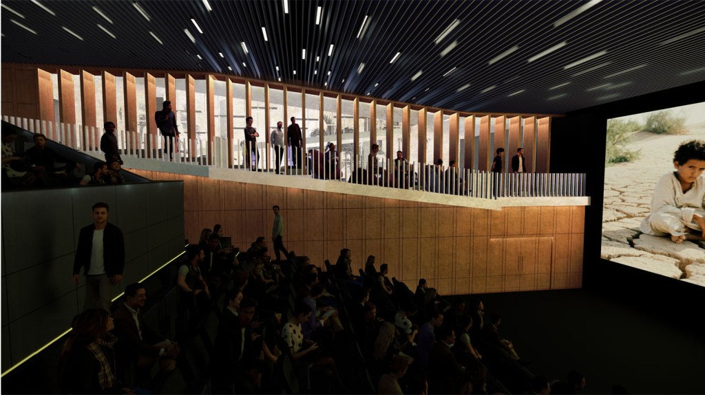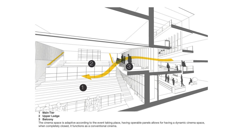 The cinema space is adaptive according to the event taking place, having operable panels allows for having a dynamic cinema space, when completely closed, it functions as a conventional cinema