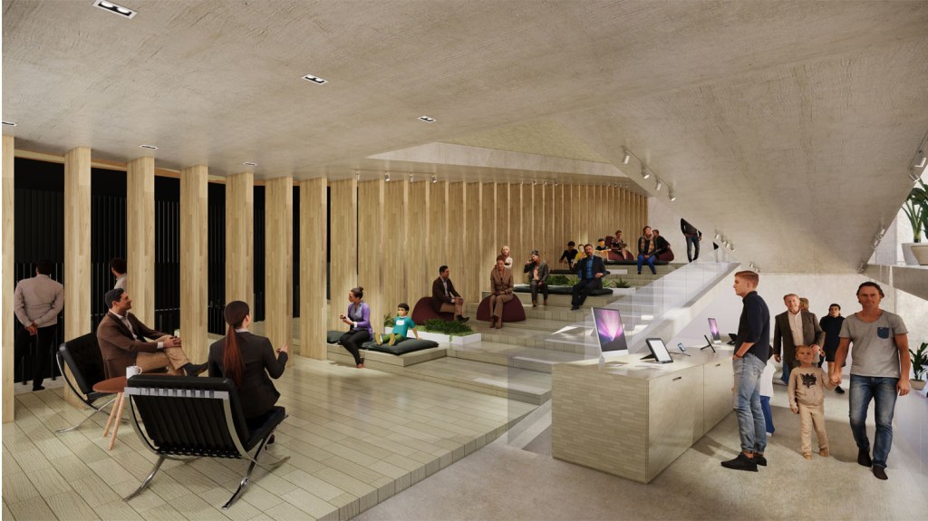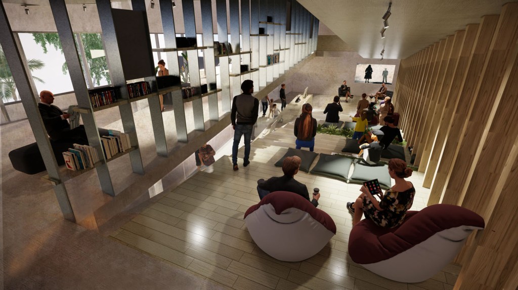 “The Ramp” functions as a vertical circulation element as well connecting the different functions of the building as it is accessible from all levels