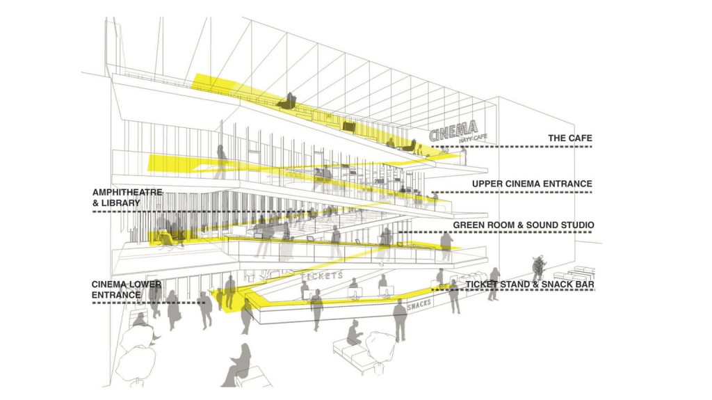 The RAMP houses and celebrates the mundane cinema-going experiences that are usually neglected due to the lack of a designated space. It adds a second layer that transforms the experience of the cinema into an interactive display and a space for creative expression and communal interaction.